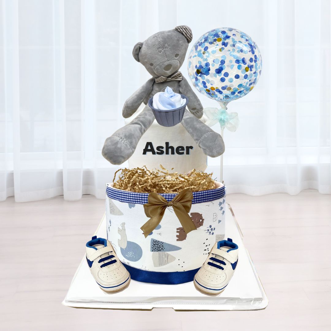 Create lasting memories with this exquisitely 2 Tier Diaper Cake Grey Teddy, perfect for welcoming special bundle of joy. This premium gift set features a sophisticated blue and grey color palette that brings together classic charm and modern elegance.