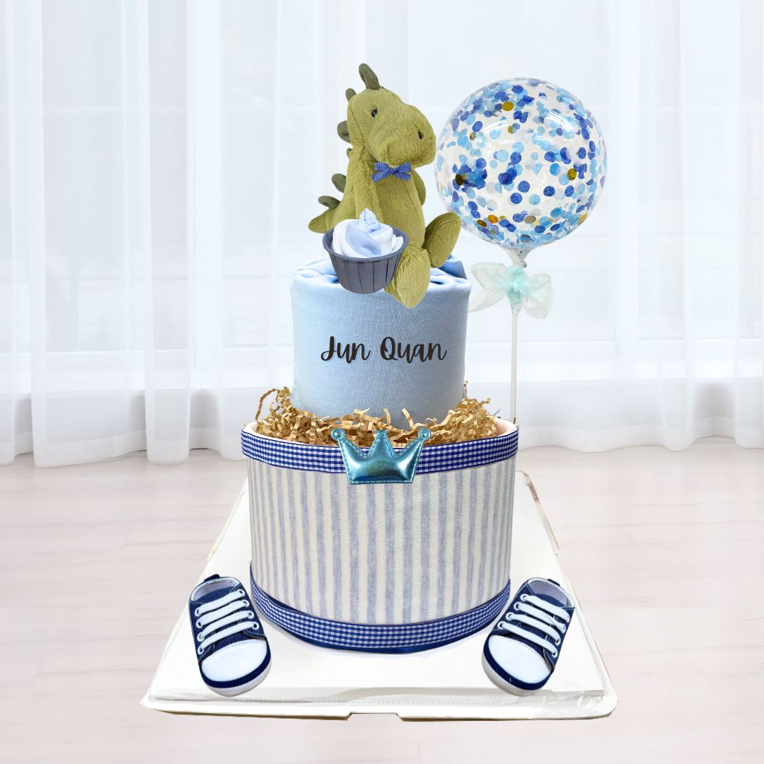 Introduce magic and whimsy to your baby shower with our enchanting Green Dino 2 Tier Diaper Cake! This beautifully crafted centerpiece features a premium design perfect for welcoming your little princess.