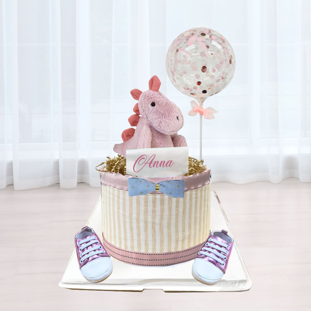 Welcome a precious new arrival with our enchanting Pink Dino Baby Girl Diaper Cake, thoughtfully curated to celebrate life’s sweetest moments. Celebrate the arrival of a precious little one with our exquisitely crafted baby girl diaper cake, a perfect blend of practicality and elegance. This thoughtfully curated ensemble features:
