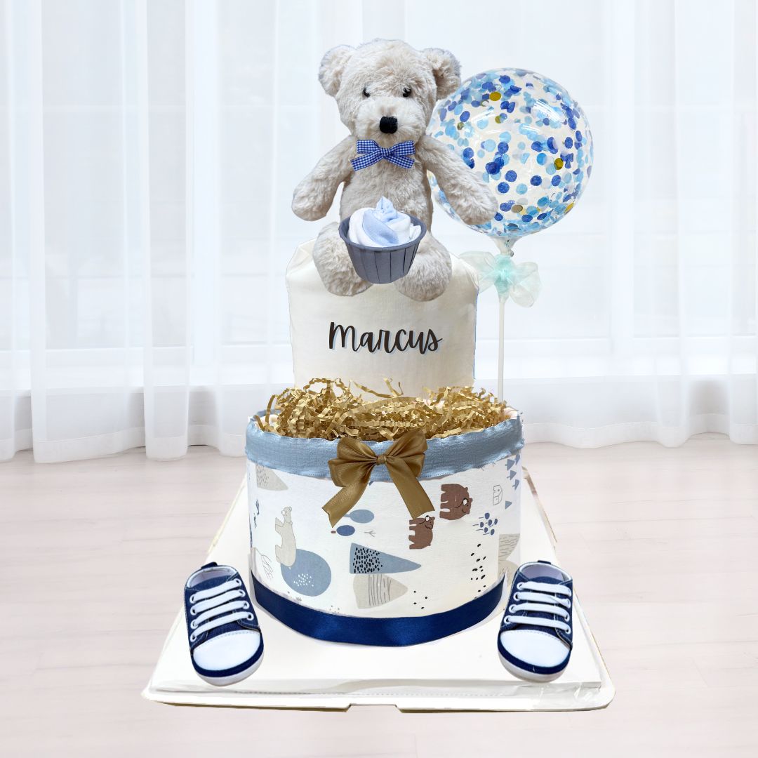 Teddy Boy 2 Tier Diaper Cake – Personalized Baby Shower Centerpiece | Perfect Baby Boy Gift